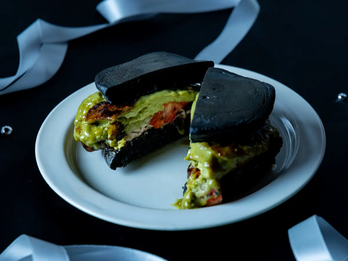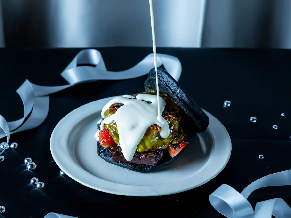 しっとりとした竹炭入りのブラックどら焼きの皮に、福岡県産あまおう、濃厚な生チョコ、抹茶の求肥、あんこホイップ、ベリーソース、そして八女抹茶のブリュレを重ねました。甘さ控えめのホワイトチョコソースは、あとがけで自由にお楽しみいただけます。甘味と苦味、和と洋が織りなす贅沢な味わいをご堪能ください。